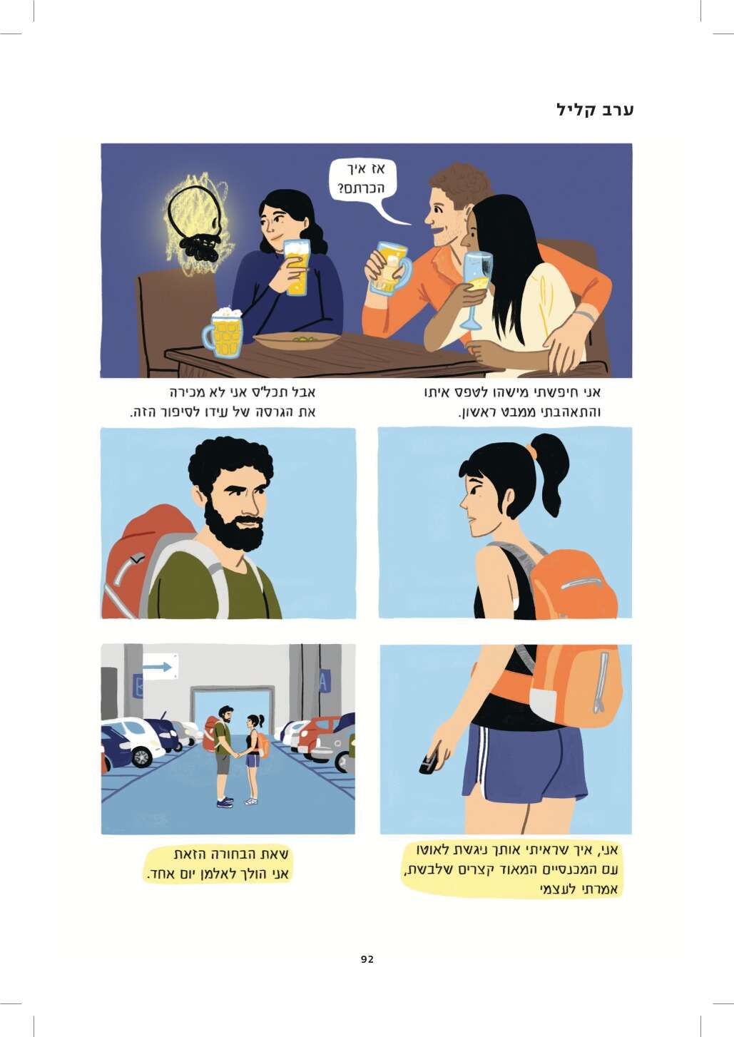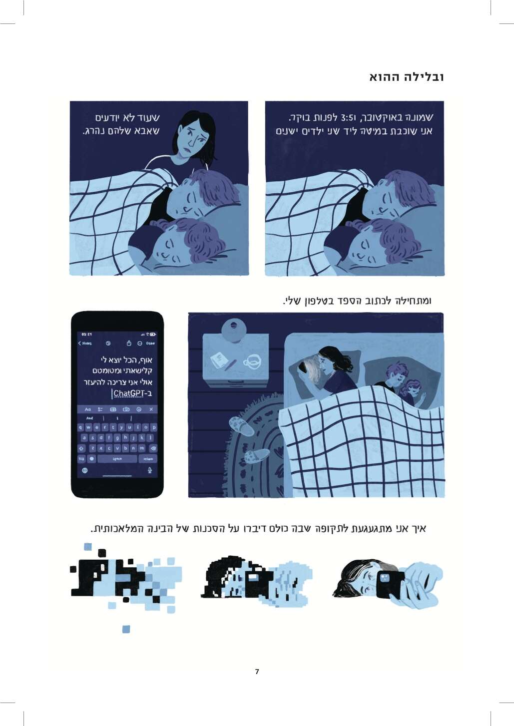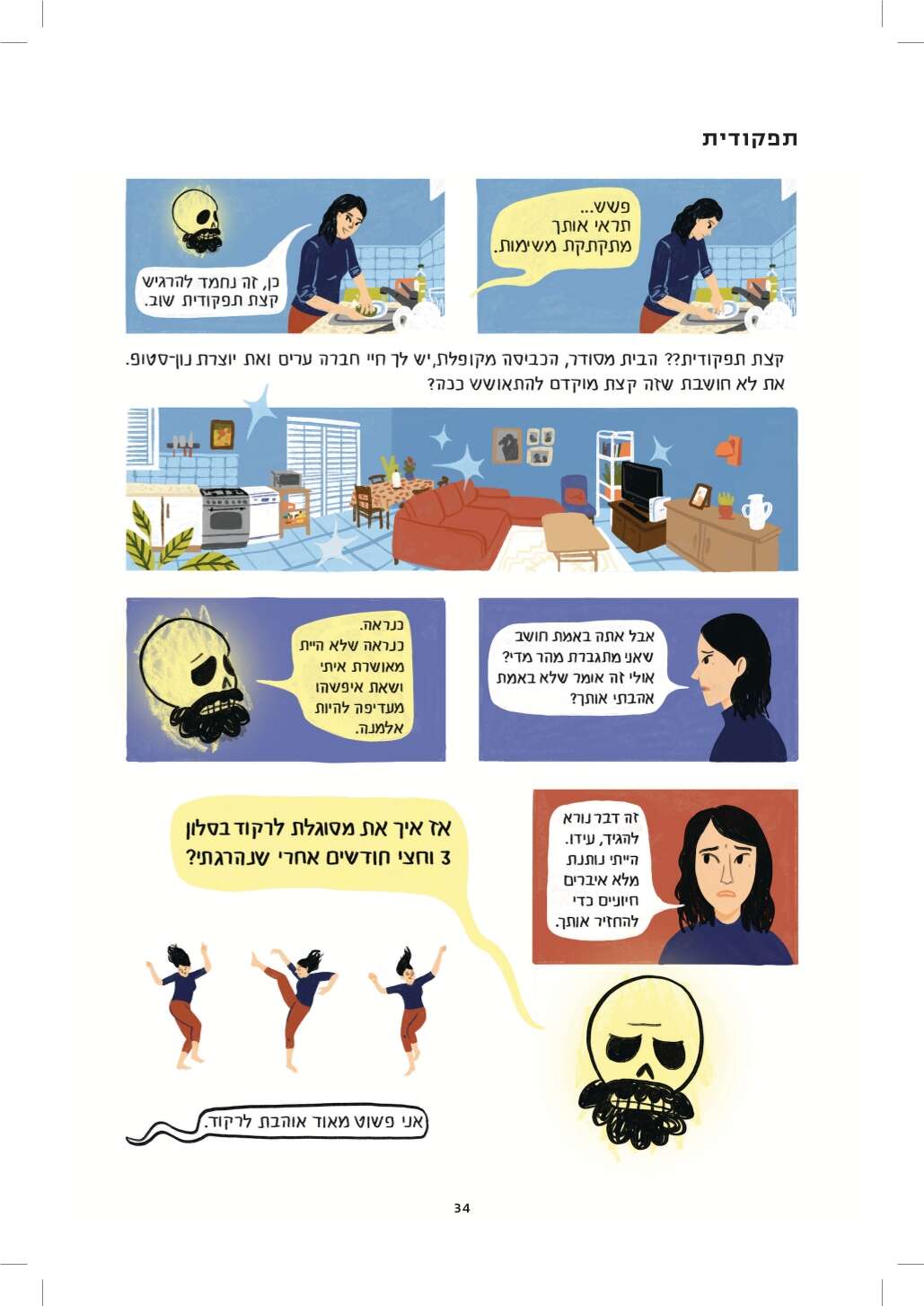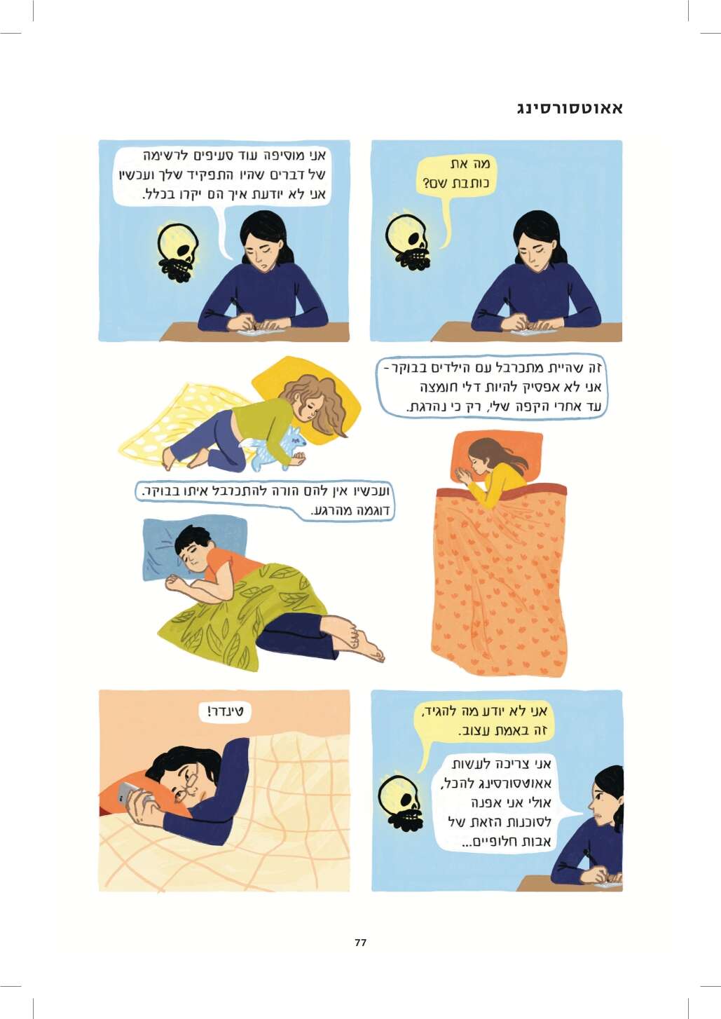 היו לי הרבה שאלות לשאול את עידו, ולא היה לי אותו. אז ציירתי גולגולת מזוקנת והתחלתי לכתוב איתה דיאלוגים. בריבועים האלה מצאתי דרך לכתוב את ההחמצה הבלתי נמנעת גם מכל הדברים שלא הספקנו ולא יהיו, אבל גם את תחושת ההחמצה על שיחות שלא היו יכולות להתקיים איתו ולא היו, כי אלו שאלות שמביאות בחשבון את העובדה שהוא מת.