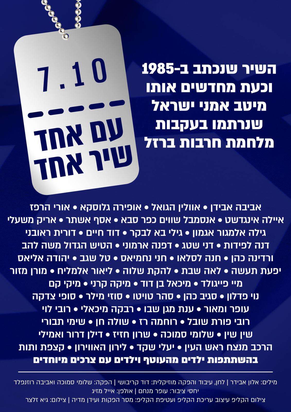 בשנות השמונים השיר "עם אחד שיר אחד", שנכתב בהשראת שיר הצדקה האמריקאי "We Are the World" ושיר הצדקה הבריטי "Do They Know It's Christmas?‎" הצליח לאסוף תרומות לנכים ומוגבלים ולקרב לבבות והפך לסוג של המנון. כעת, במלאת חודש למלחמת חרבות ברזל ולראשונה מאז 1985, כותב השיר המקורי אלון אבידר הוסיף בית חדש בעקבות המלחמה: