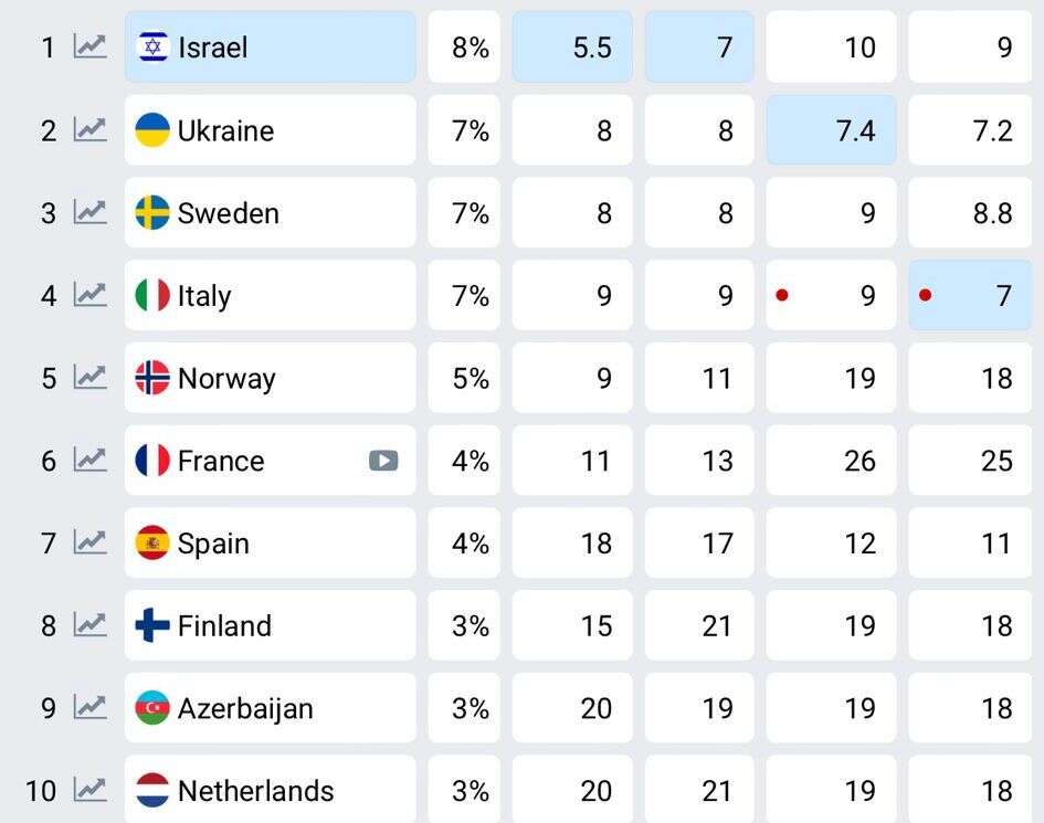 ההימורים עלינו, ניתן להניח ואף להיות בטוחים, הם על רקע המלחמה ומעט מפתיעים לנוכח גילויי האנטישמיות באירופה. נוסיף שנציג ישראל בתחרות והשיר אותו יבצע טרם נבחרו. במקום השני, כפי שניתן לראות, מדורגת אוקראינה, גם שם מתקיימת עדיין מלחמה, וכזכור היא זכתה בשנת 2022.