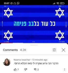 תגובות נוספות כללו הצהרות כמו "השיר הזה נותן לי תקווה שיום אחד כולנו נמות"; "נפתלי מתהפך בקברו"; "זה בלתי אפשרי להוציא סרטון בעברית שיקבל 10K דיסלייקים ביום אחד". "עומר אדם & נועה קירל: 'Hold my beer'";"לפני שבוע וחצי ירו לי רקטה על הבית. השיר הזה מדכא אותי הרבה יותר"; "ואז אבדה תקוותנו"; ו-"מדווח ליוטיוב. סרטון פוגעני. תדווחו גם אתם ויבוא שלום על ישראל".