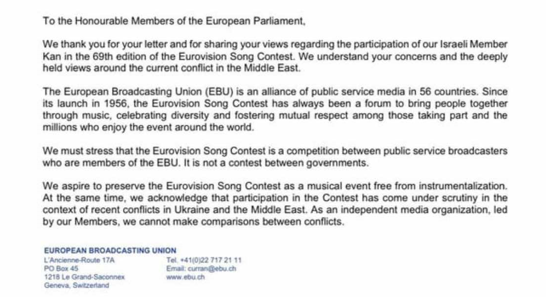 במכתב צוין כי "כארגון תקשורת עצמאי, איננו יכולים לערוך השוואות ישירות בין סכסוכים", ובכך הבהירו באיגוד כי ההחלטה בנוגע לרוסיה הייתה ייחודית למקרה שלה, ואינה תקפה למצב במזרח התיכון. במכתב נכתב בתגובה לפונים כי "כשם שציינתם, ה-EBU קיבל את ההחלטה להשעות את השתתפותה של רוסיה באירוויזיון בשנת 2022, בעקבות הפלישה לאוקראינה.