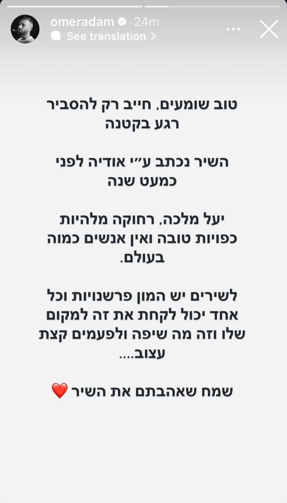 אדם העלה סטורי לחשבון האינסטגרם שלו והסביר את הדברים שעוררו סערה ברשתות החברתיות. "טוב שומעים, חייב רק להסביר רגע בקטנה", פתח אדם את דבריו בהתייחסו לשיר החדש.