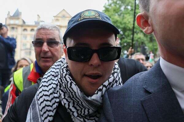 ליאם או'הנה התקבל מחוץ לבית המשפט המחוזי בווסטמינסטר על ידי קהל תומכים ומעריצים גדול - רבים מהם נשאו דגלי פלשתין.
