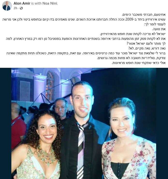 בפוסט שפרסם פרשן האירוויזיון אלון אמיר הערב (ראשון) הוא כתב: "אחינועם, חברתי משכבר הימים. עשינו אירוויזיון ביחד ב-2009 וככה החלה חברותנו ארוכת השנים. שנינו מאמינים בדו קיום ובחופש ביטוי, ולכן אני מרשה לעצמי לומר לך: את טועה. ישראל לא צריכה לקחת שנת חופש מהאירוויזיון".