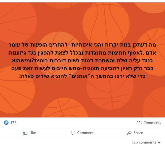 "אנחנו לא צוחקות ואנחנו לא אוהבות את זה שמשתמשים בסממנים של התרבות שלנו בשיר שבא להקטין ולהזכיר לנו את הזרות שלנו. מעבר להקטנה של אותה דמות של אישה רוסייה שלוחצת על חתונה ומשתכרת, ויודעת רק 'דה' ו'נייט' ו'נזדורוביה'. יש גם משחק מילים 'משעשע' שבא להזכיר לנו את הסטיגמה המפורסמת והפוצעת - של נשים רוסיות זורמות, קלות להשגה. אני נזכרת בכל אותן רמיזות שאני חוויתי במהלך חיי מנערים ומגברים. חלקם צחקו, חלקם דיברו ברצינות. על זה שרוסיות נולדות עם חוטיני, על זה שהן טובות במיטה (כמחמאה - ברור), על זה שהן זורמות ומנוסות".