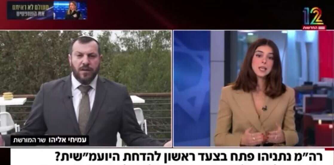 שר המורשת, עמיחי אליהו, ממפלגת עוצמה יהודית התראיין לפני שעה קלה לחדשות 12, התעצבן משאלותיה של המגישה עדי זריפי, ונטש את השידור.