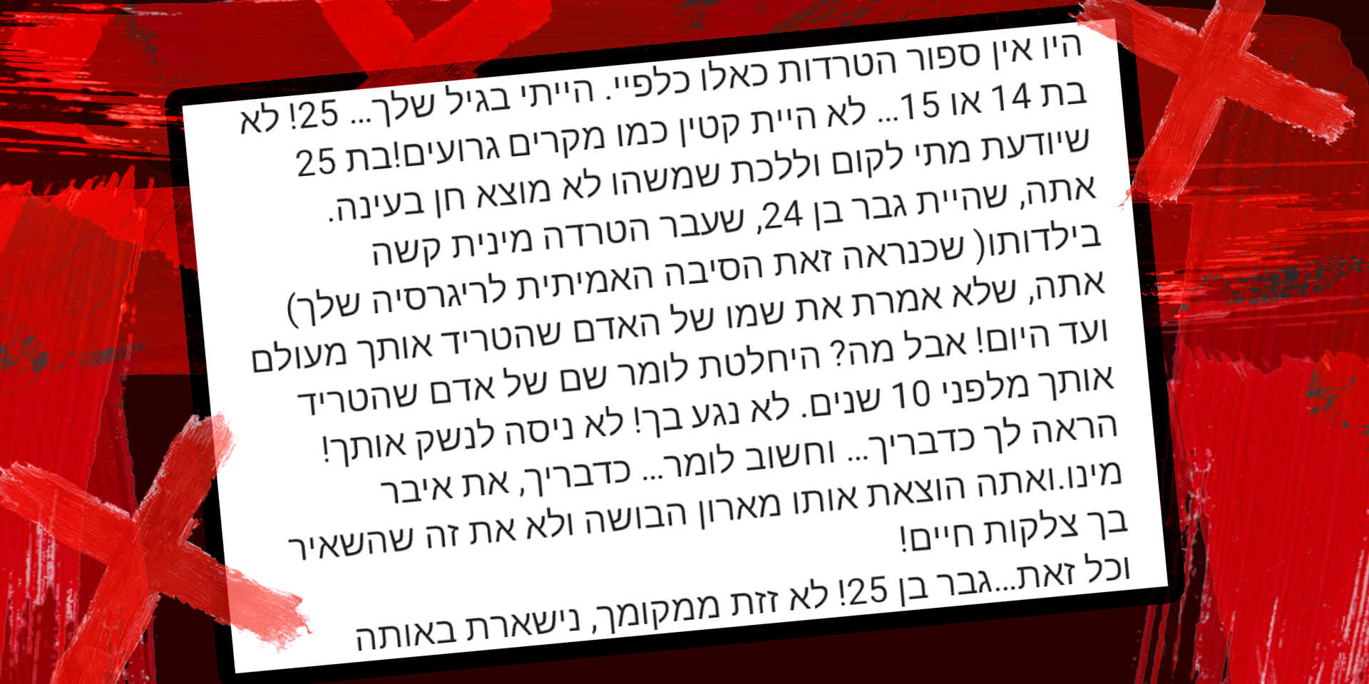 "היום אני מכה על חטא. מודע ונגעל ממי שהייתי ועושה הכל לתקן בשביל העתיד של הבת שלי. וכשאני רואה את כל סיפורי האונס וההטרדות של כוכבי ישראל (והעולם) אני מבין בדיוק מאיפה זה בא".