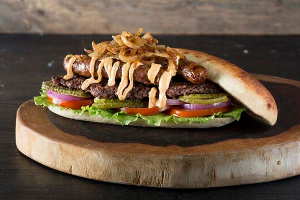 מה בכריך: לחם ממולא בשר, טחינה, ירקות והכל עובר תנור