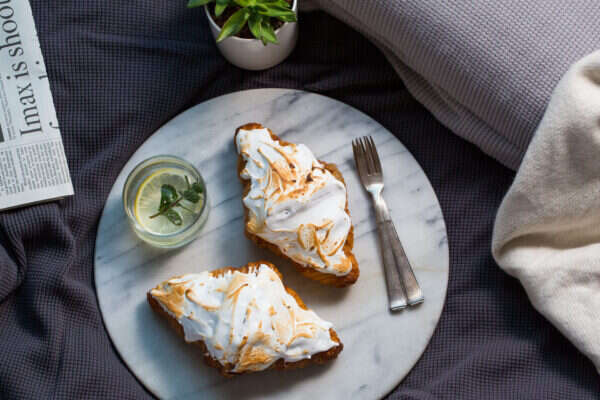 כריך קרואסון פתוח במילוי תותים בשמנת- קרם פרש, תותים טריים ואבקת סוכר // איתיאל ציון