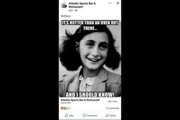 מסעדה בטיברטון, עיירה בת 16 אלף תושבים שבמדינת רוד איילנד, ארה"ב, פרסמה בעמוד הפייסבוק שלה פוסט אנטישמי, שאם אכן הועלה בתום לב, ממחיש עד כמה המודעות לשואה נמוכה במקומות מסוימים. בסוף השבוע האחרון העלתה המסעדה, Atlantic Sports Bar And Restaurant, מם שמתייחס למזג האוויר הלוהט ששורר באזור, ובו תצלום של אנה פרנק לצד הכיתוב "חם שם בחוץ יותר מתנור, ומי כמוני יודעת!" וההשטאג #ohboy.