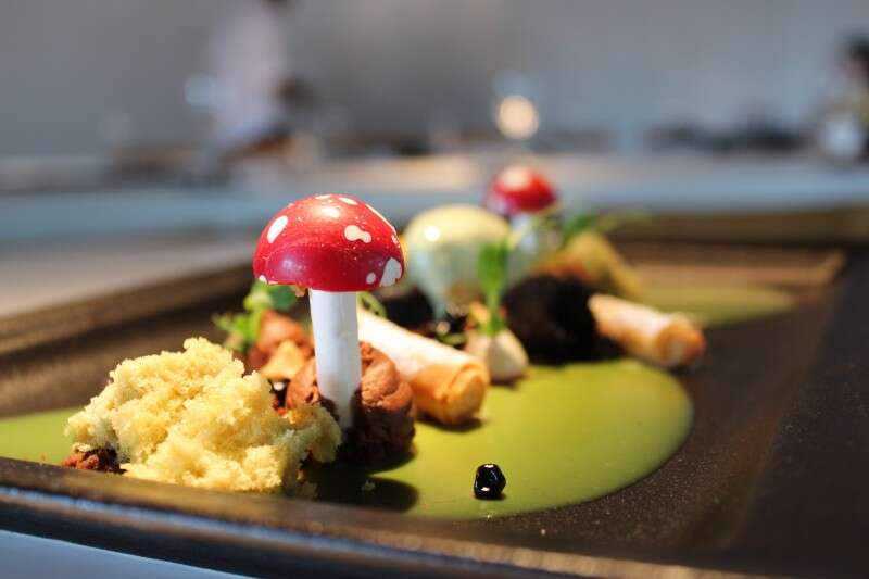 גם בגינה היו כמה הבזקים של אור, הפטרייה (עשויה ממרנג) הצליחה לחמם את הגזרה והייתה טעימה, קרם הפיסטוק וגם מוס השוקולד היו חביבים, אבל סלעי הקרמל היו בעלי מרקם מוזר, לא של קרמל רך ולא של קרמל קשה אלא של סוכר שאבדה דרכו אי שם בדרך לקרמול, וגלידת המסקרפונה הכילה גבישי קרח לא ברורים. הרבה פחות ממה שציפינו. הדיסוננס היה כל כך גדול בין המראה, שבאמת לא מוצאים הרבה בארץ, לבין הטעמים. ניכר שהושקעה מחשבה עצומה באופן הגשת המנה אבל גם כאן, הביצוע פגע בטירמיסו.