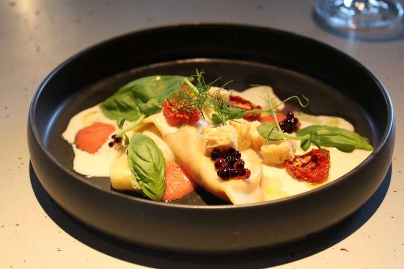 במנות הראשונות בחרנו ברביולי עגבניות צלויות, שנחים על פונדו של גבינה כחולה, בזיליקום, צימוקי שרי, קרוטונים ופניני בלסמי. מנה מורכבת לכל הדעות, המציגה את המטבח האיטלקי ההפוך, במקום להניח את הרביולי ברוטב של עגבניות ולמלא בגבינות, הרביולי מולאו בעגבנייה ונחו על פונדו גבינה. מנה טעימה ומרשימה שהייתה עשויה טוב. הראשונה הנוספת שבחרנו, הייתה ניוקי לחי עגל עם עגבניות מעושנות, שומר וצ'יפס קייל. גם הראשונה הזו הייתה עשויה טוב, העגל היה רך ונמס בפה, הניוקי היה מטוגן ונימוח וצ'יפס הקייל היה חביב, אבל לא באמת מרכיב מהותי במנה אלא יותר בגזרת העיטורים, שגם זה חשוב במטבח מודרני.