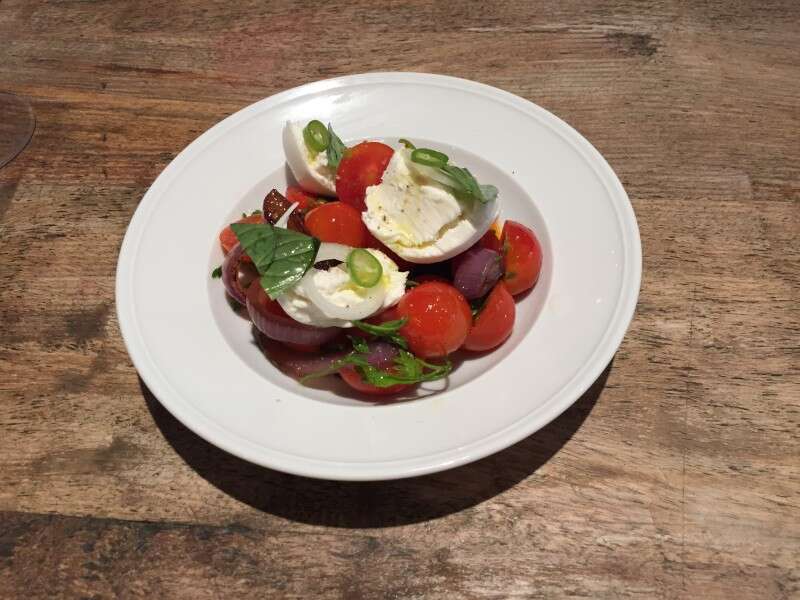 אחרי לחם מחמצת לבן וממרח דלעת צלויה בשמן זית, שמזכיר את הצ'רשי הטריפוליטאי, אבל כמובן עדין יותר בטעמים (16 ₪), הגיעו הראשונות. סלט עגבניות שרי עם בצל סגול, צנונית, קרעי מוצרלה ובזיליקום. נכון כולנו מכירים כבר סלטי עגבניות מכל המינים, הצבעים והצורות ויכולתי בקלות לבחור מנה אחרת מן ההיצע, אבל דווקא במנות האופייניות נמדדת לדעתי גדולה ויצירתיות של שף וכמו שחשדתי, בסלט הזה, היה קסם אחר. דבר ראשון, הבצל הסגול חרוך, מה שנותן טוויסט נפלא למנה והופך את הרעננות למתוקה יותר. דבר שני, המנה כולה נחה על קרם שרי שהופך את הסלט למעודן בצורה שונה, עם נגיעות קטנות של חמיצות, שמשתלבת נפלא עם המתיקות מהדבר הראשון.