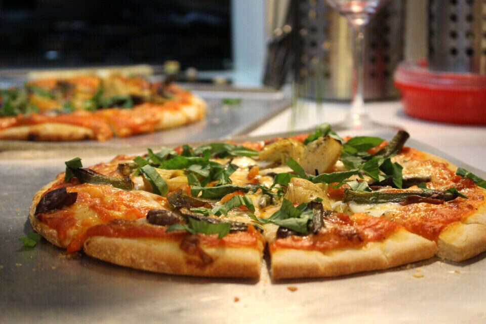 הדיבורים נפסקים אט אט, כשמגיעות לשולחן מנות נוספות. קרפצ'ו בקר שספג אליו שמן זית מעולה, קרפצ'ו של לברק ים, שללא ספק יודע מה התאריך כי מקשטים אותו בסברס וגרגירי רימון, אבל גם צנוברים קלויים ופלפלים אדומים חריפים. סלט משגע של חציל על האש, עם במיה שנצרבה בתנור ועגבניות צלויות ובצל סגול. הבמיה הייתה עשויה מעולה, לכן היא שימשה ובצדק גם כתוספת על פיצה דקה, לצד תוספות כמו ארטישוק, עגבניות וזיתי קלמטה.