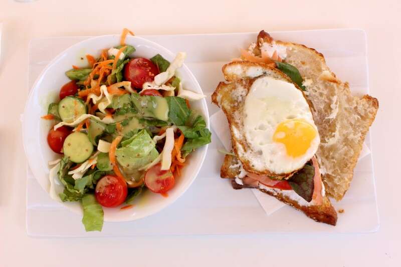 הבחירה הראשונה הייתה ארוחת בוקר סקנדינבית (49 ש"ח) שמציעה סוג של מאפה מבצק עלים עם גבינת שמנת, סלמון מעושן, ביצת עין, עגבנייה ועלים ירוקים. ארוחת הבוקר הזאת מגיעה עם שתייה וסלט לבחירה. אנחנו בחרנו בסלט ירוק חביב המורכב מחסה, כרוב, גזר מגורד וחצאי עגבניות שרי בויניגרט חרדל תעשייתי מעט, אבל טעים. לצד הסלט הזמנו קפה קר שהגיע בכוס גבוהה וגם קיבלנו אספרסו לחיזוק ללא תוספת במחיר. המאפה טעים, הבצק של המאפה מתאים לסוג של בצק של כריך, הוא פריך מבחוץ רך מבפנים.