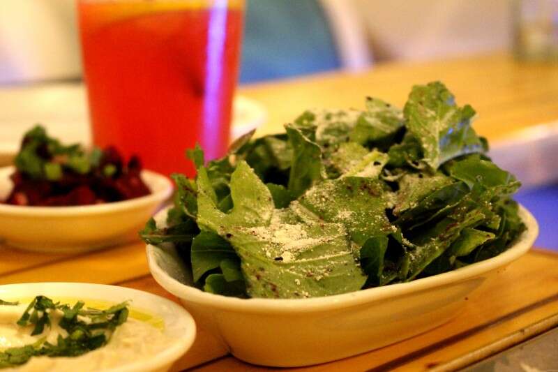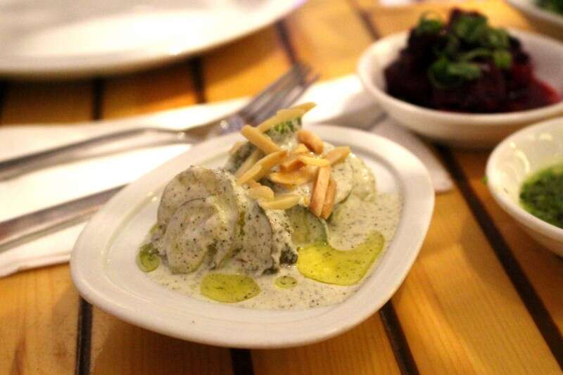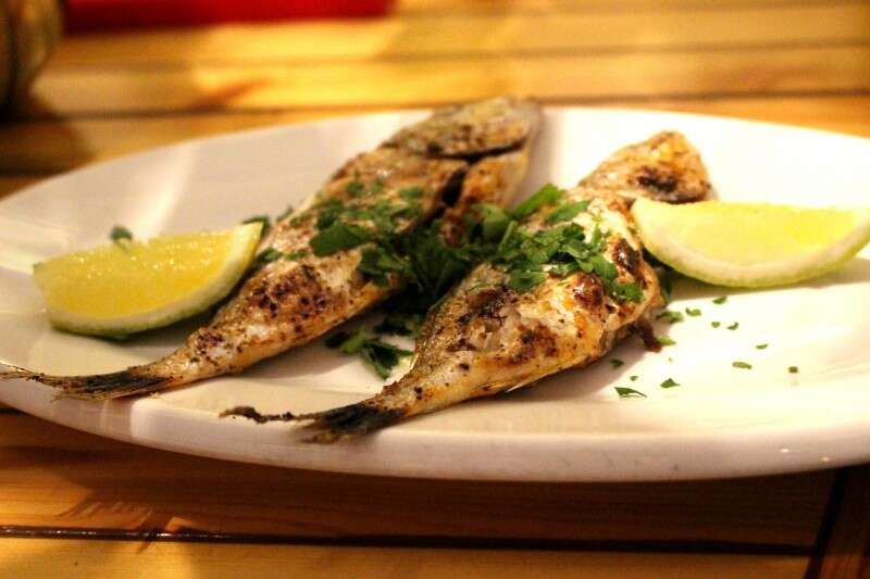 היו שם עוד מיני קעריות: סלט משגע של זוקיני שנצרבו על הגריל ונזרקו לבריכת יוגורט חמצמץ עם נענע, ושקדים פרוסים. היה שם גם סלט של סלק חי בלימון, סלט של עדשים ואגוזי מלך, חריף ירוק ועוקצני, זיתים ענקיים ועזי טעם, סלט של גזר בקצח וגם טחינה נהדרת. כל זה היה הסחת דעת מופלאה מהעיקר וכמעט ששכחנו שבאנו בשביל הדגים.
