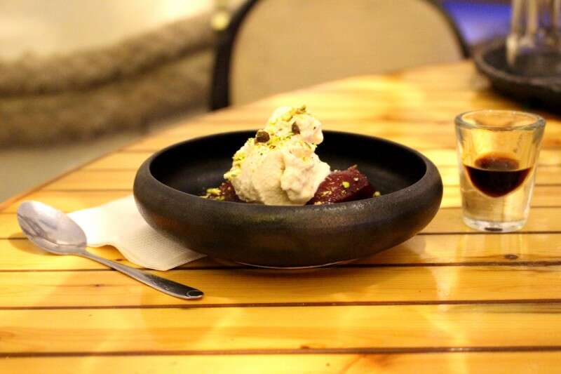 היו כמה אפשרויות לקינוח באותו היום ובחרנו בחבוש מבושל בליקר כלשהו ומוגש עם קרם פרש ופיסטוקים. פינקו אותנו בצ'ייסרים אבל היינו מאושרים כבר לפני זה.