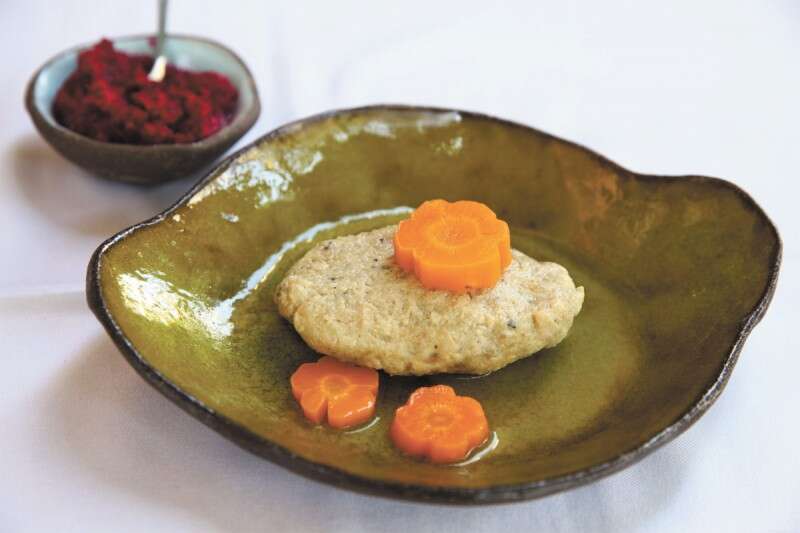 גפילטע פיש מסורתי בשתי צלחות שונות - באחת קציצת דג מבושלת (26 ש') ובאחרת דג מבושל וממולא (34 ש') - שתי הגרסאות בתוספת פלחי גזר מבושל וצלוחית חזרת, ובשתיהן חסר מעט מלח. החזרת היתה מתוקה ויש כאלה שמעדיפים אותה כזאת. אני פחות.