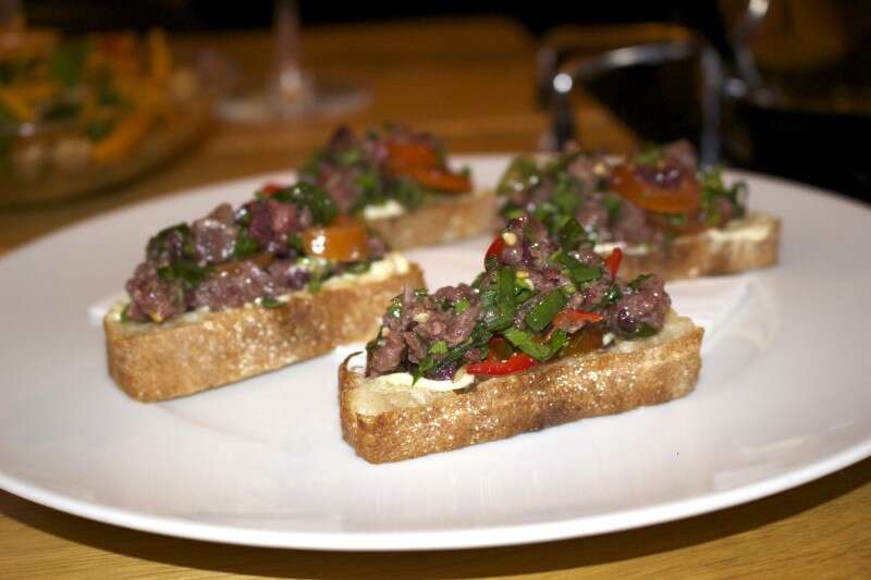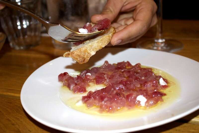 לקחנו פסק זמן מהים עם ברוסקטות של טרטר בקר (47 ש"ח) ונקניקיות בראטוורסט (73 ש"ח). הברוסקטות הגיעו כארבע פרוסות של לחם שנאפה בטאבון ועליו איולי שום ובשר נא מפורק, עם בצל ירוק ופלפלים אדומים חריפים. מנה מצוינת, אבל הרבה יותר חריפה מהמצופה והיה מי שנאלץ לדלות את הפלפלים מהפרוסה שלו ולמחות דמעה. הנקניקיות הגיעו עם כרוב כבוש מעולה, קצת מעט מדי ממנו, והיו רכות ועסיסיות.