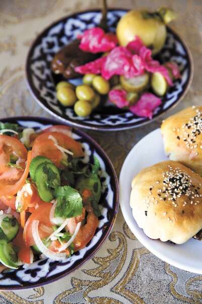 שתי הצלוחיות הראשונות שהונחו על השולחן משכו פחות תשומת לב. היו שם חמוצים, ובהם עגבנייה, חצילים קטנים, זיתים וכרוב (15 ש'), וסלט ירקות בוכרי פשוט למדי של עגבניות, מלפפון, בצל ועלי כוסברה (10 ש' קטן, 15 ש' גדול). הסלט מתובל בעדינות אך לאחר כמה פרוסות ביקשנו לשמור מקום לכל העתיד לבוא. וטוב עשינו.