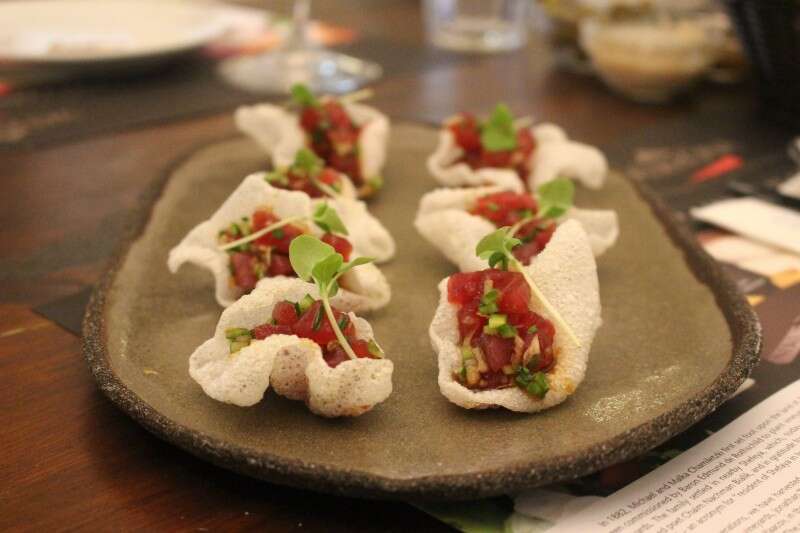 לראשונות בחרנו שתי מנות מהתפריט הרגיל, מאפה בירה וקממברט וטרטר קריספי רייס. מאפה הבירה היה לא פחות מנהדר. מדובר בפרוסות לא דקות של לחם בירה ספוג בחמאה, רך ולח, ועל כל פרוסה מונח משולש קמבברט איכותי מאוד. מלמעלה נקודה קטנה של ריבת יין שחבל שהיתה רק נקודה, שכן הוסיפה מאוד לטעם. בצד סלט רוקט ותפוחים קטן בויניגרט סילאן, מנה שעמוסה בטעמים מתוקים אבל מוצדקים אחד אחד.