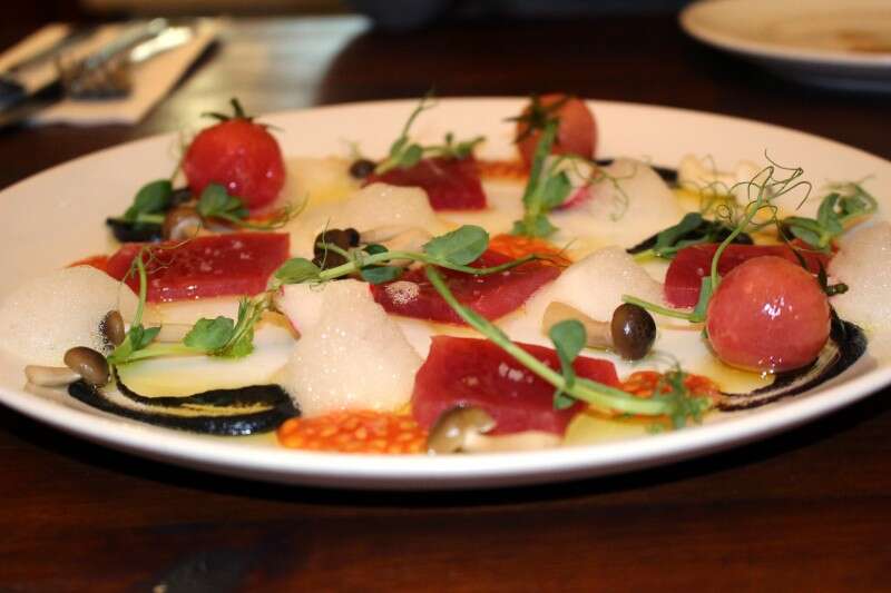 מתפריט הספיישלים המפתה בחרנו בקרודו סשימי של טונה אדומה, קרודו הוא בעצם הסשימי האיטלקי. המנה שהגיעה אלינו היתה באמת שילוב מרשים של סגנונות- נתחי טונה טריים לצד פטריות שימג'י מוחמצות, שרי קונפי, צנוניות, גבעולי אפונה ריחנית, זרעי עגבניות, קרם חצילים שחור וקציפת יוזו - טוויסט מולקולרי. מנה יפה ומורכבת, שלא כל המרכיבים בה חיוניים, אבל חלקם עובדים נהדר זה עם זה, בעיקר הטונה, הפטריות וקרם החצילים.
