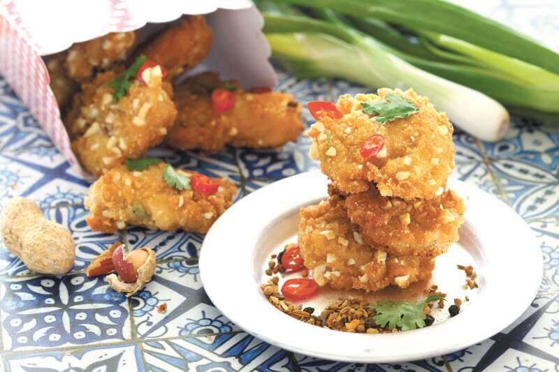 צלחת פשוטה של עוף ותפוחי אדמה מעולם לא נראתה זהובה ומבריקה כל כך. נתחוני העוף טבלו בבלילה סמיכה של חמאת בוטנים וקארי וצופו במעטפת עבה של פירורי לחם ובוטנים. שכשוך קצר בשמן החם והפיתוי לזלול כמעט פראי. פרוסות דקיקות של תפוחי אדמה הופכות למעין סופגניות פפריקה שנטרפות כחטיף לוהט.