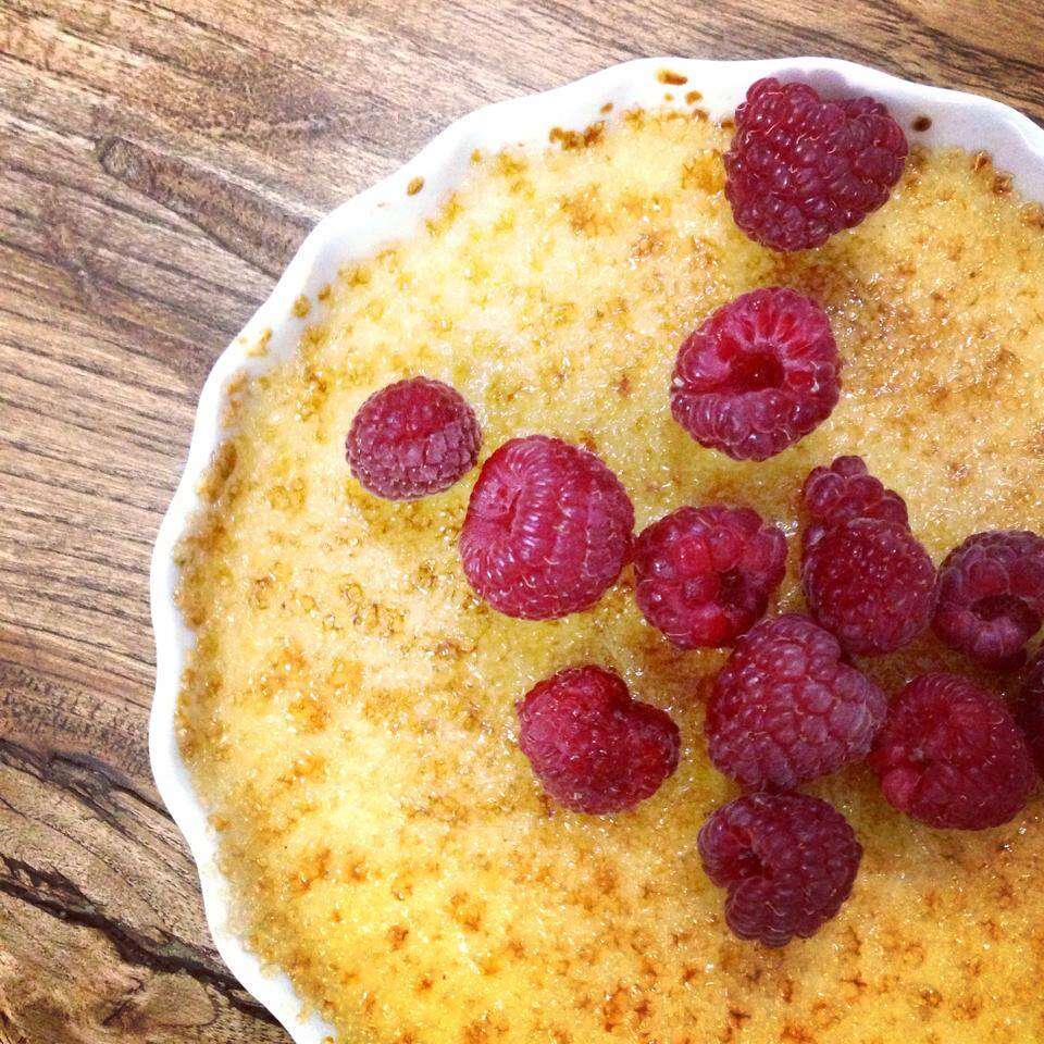 8. מיד לפני ההגשה מפזרים על הקרם שלנו כ-1.5 כפות של סוכר דמררה - מכסים בשכבה אחידה ודקה את כל הקרם בסוכר. באמצעות ברנר מקרמלים במהירות ובעדינות את שכבת הסוכר, מבלי לחמם את הקרם עצמו. אם אין ברנר בבית, ניתן להקפיא את הקרם, להכניס תנור על מצב גריל ולקרמל את הסוכר. אם בחרתם באופן זה, יש להיזהר לא להשאיר את הקרם לזמן רב מדי כדי שלא יתחמם.