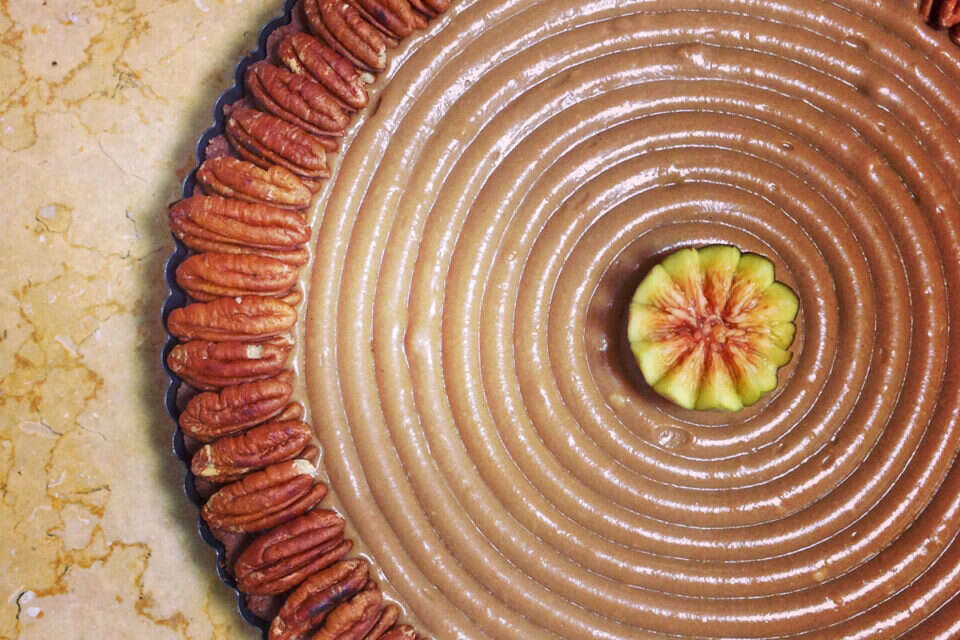10. כשהקרם קר מעבירים אותו לשקית זילוף עם צנתר חלק ומזלפים על גבי הגנאש. ניתן לקשט עם אגוזים שונים. אני בחרתי בפקאנים כדי שיוסיפו עוד טעם מיוחד לטארט.