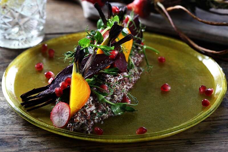 בצל אדום, שום, טימין, יין לבן, קינואה אדומה, חמאת קשיו, פטרוזיליה, מיץ לימון, סלקים צלויים, מיקרו אפונה, זרעי רימונים, צנוניות פרוסות