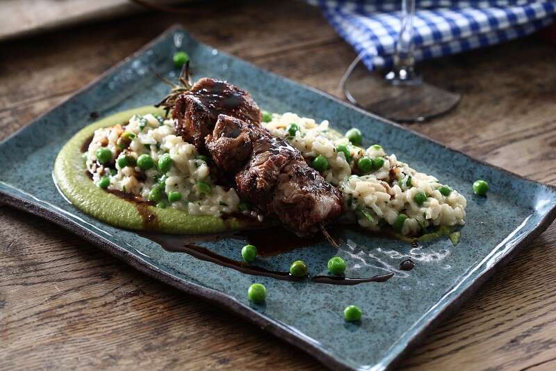 ריזוטו- ואיך לא?! ריזוטו לבן קלאסי, אפונה עדינה, חמאה, פרמזן, מיץ לימון, פטרוזיליה, קרם של אפונה וחזה אווז מעושן בתוספת קוביות שוק טלה על שיפוד רוזמרין.