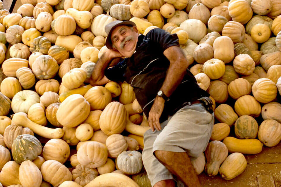 משה תלם והדלועים // צילום: איתיאל ציון // משה תלם והדלועים. חמישים שנה של אהבה כתומה