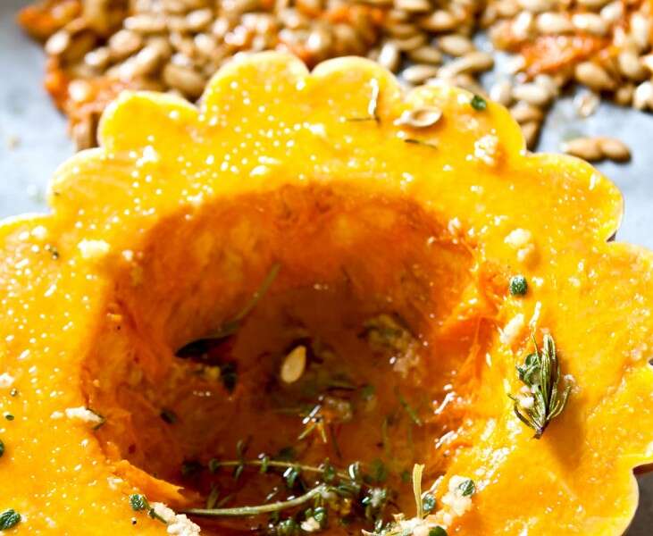 שוטפים דלעת תאילנדית, חוצים אותה באמצע ומוציאים את הגרעינים. בקערה מערבבים שמן זית, שום כתוש, עשבי תיבול, מלח גס ופלפל גרוס. מורחים את הדלעת היטב בתערובת ואופים בתנור שחומם מראש ל־180 מעלות כ־40 דקות. כשהדלעת התרככה מפזרים מעליה פירורי לחם ופרמזן ואופים עוד כ־10 דקות בחום 220 מעלות.