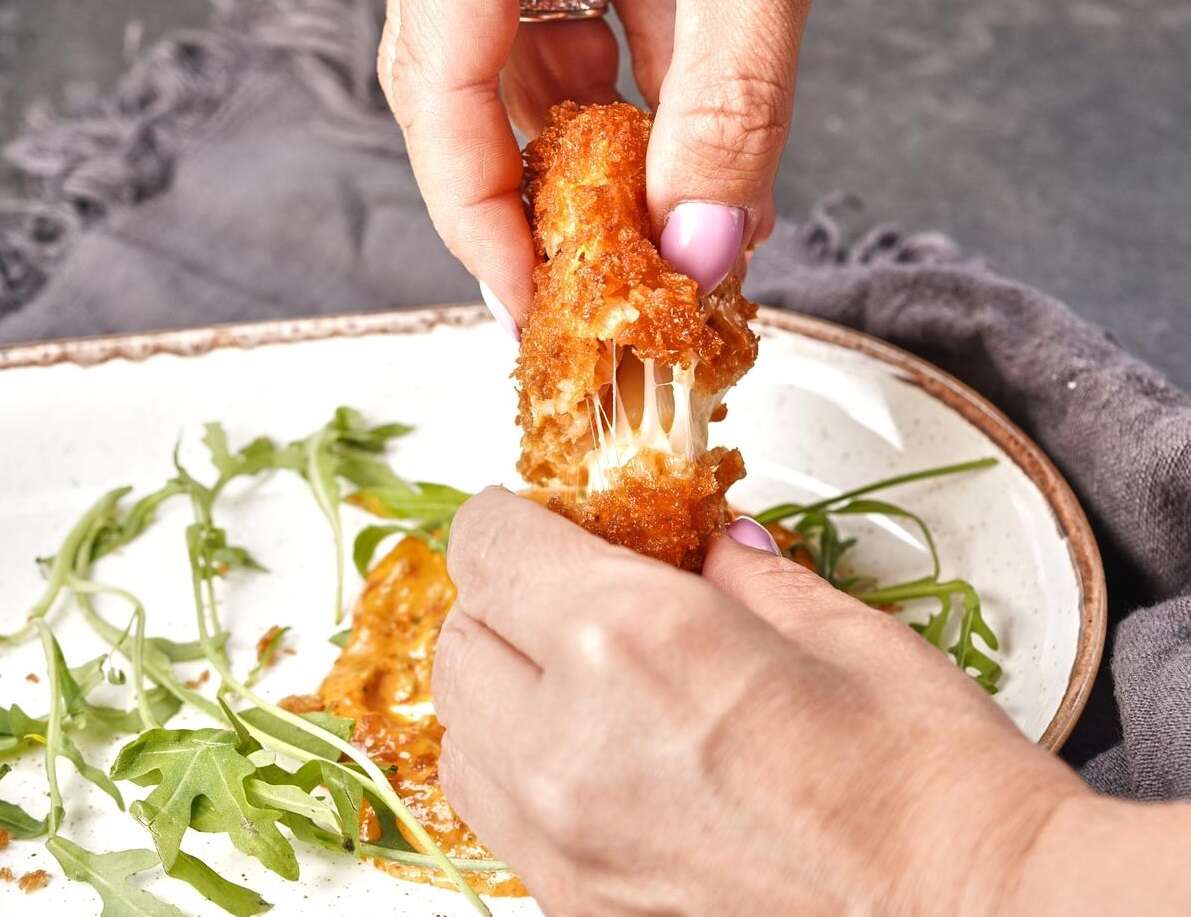 את הכדורים ממלאים בקוביות המוצרלה ויוצרים צורה אובלית באורך כ- 6 ס"מ.