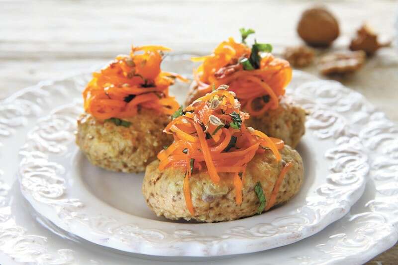 ראשון, כבד קצוץ כמעט פשוט אך כלל לא. תוספת קטנה של שום קונפי ותלולית מבריקה של ריבת בצל ויין אדום, ורובד הטעמים משתנה לחלוטין. את הקניידלך שאני כה אוהבת הפכתי לכופתאות מצה הודיות. שפע בוטנים קצוצים וזרעי כוסברה גרוסים, והמרקם של אלה שונה ומופלא. גם הגפילטע פיש לא חמק מבין אצבעותיי הנחושות. קציצות הדג חיוורות הטעם נצבעו פפריקה מעושנת ועוטרו בסלט גזר חצוף שתובל באריסה עוקצנית.