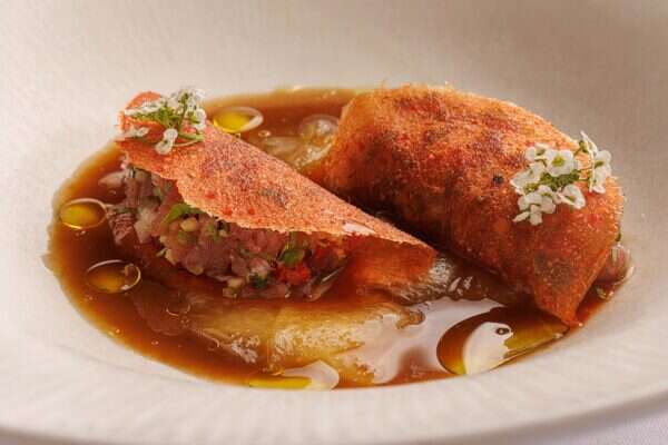 ראשונה הגיעה לשולחן צלחת פתיחים לזוג (120 שקלים). היא שילבה שלושה ביסים שונים לחלוטין שלוקחים את התודעה למקומות שונים, אבל גם מתכתבים אחד עם השני ו״יודעים להראות את היד של השף״, הסביר המלצר. האחד, ליצ׳י חרוך בשמן צ׳ילי עם סלסה ג׳ינג׳ר ופינגר ליים שהגיע בתוך קליפת הצ׳ילי - ביס מענג ופרשי שלוקחים עם כפית כמו ממעדן ומשלב טעמים טרופיים, מתיקות ופיקנטיות. הביס השני היה של סינטה טלה כבוש על טוסט של פסטו פיסטוקים והשלישי היה טוויל של לחם אפריקאי עם קרם ביצים רכות, פסטרמה דג טונה בתבלינים במרקם נגיס ובצל מעושן ומוחמץ - מנה מעט כבדה יותר המשלבת מגוון טכניקות וכבר לוקחת את החיך צעד קדימה אל תוך הארוחה.