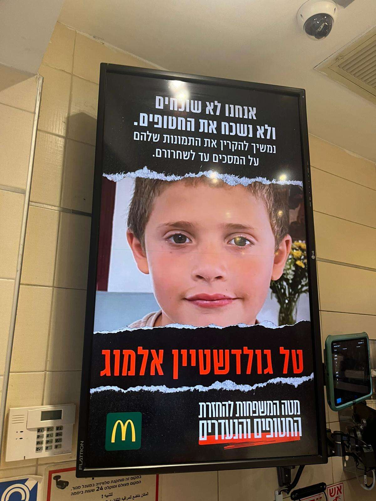 ענקית המזון המהיר בישראל הקצתה בסניפי הרשת מסך לטובת פרסום תמונות החטופים, בו מוקרנות תמונותיהם בזו אחר זו. על המסך כתוב: "אנחנו לא שוכחים ולא נשכח את החטופים. נמשיך להקרין את התמונות שלהם על המסכים, עד לשחרורם". בתחתית המסך בצידו הימני, נמצאת חתימתו של מטה המשפחות להחזרת החטופים והנעדרים ומצד שמאל מופיע הלוגו של מקדונלד'ס.