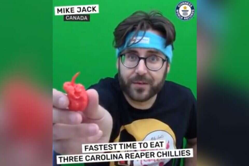 מייק גק הקנדי שובר שיא גינס באכילת הפלפל החריף בעולם // צילום: מתוך הפייסבוק של גינס