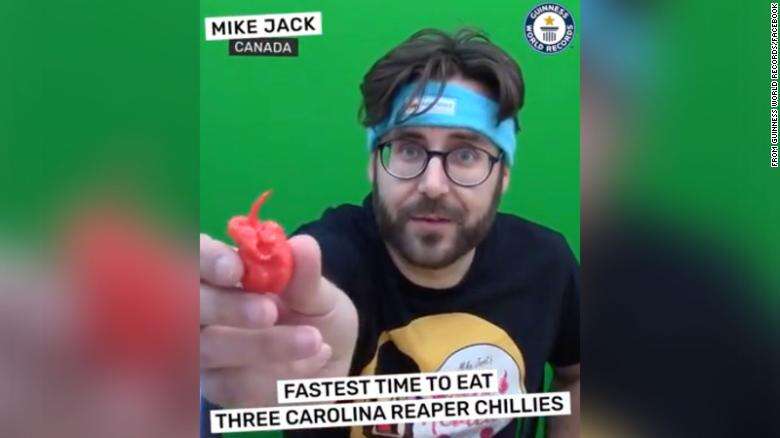 בחזרה למייק ג'ק הקנדי. הוא שבר את שיא גינס העולמי לאכילת הכמות הגדולה ביותר של אותו מלאך מוות מקרולינה בהכי מעט זמן. שלושה פלפלים ב9.72 שניות. השיא הלא פחות ממטורף הזה פורסם בדף הפייסבוק הרשמי של גינס וכהוכחה גם צורף הסרטון שאתם רואים בכתבה זו.