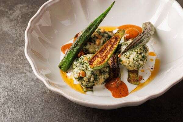 אחר כך הגיעה הסביצ'ה. נתחי הדג, כנראה מוסר ים, נעטפו בעלים קעורים של חסה מסולסלת והוגשו לצד קערית של וויניגרט בזיליקום לטבילה. מבחינה הנדסית, המבנה היה מורכב ואפילו מרשים, אבל השורה התחתונה שלו הייתה חמיצות עזה ובלתי מאוזנת בעליל. זו המלכודת הראשונה של כל סביצ'ה, שבה דווקא נתחי הדג, השומניים והתפלים, אמורים לרסן במעט את שאר המרכיבים. פה זה לא קרה, וחבל.