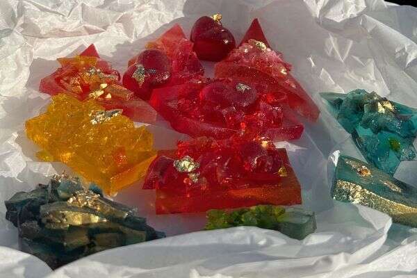 - לאחר הקירור: מחלצים את הג'לי שנוצר מהתבניות וחותכים לצורות שונות. מוסיפים זהב ונצנצים (אם רוצים) ומעבירים לייבוש של שבוע - שבוע וחצי (תלוי בעובי הממתק). חשוב להתאזר בסבלנות בשלב הזה ולא "לעגל פינות" אם רוצים לקבל תוצאה מושלמת. ניתן כמובן לבדוק אם זה מוכן לפי מידת הקראנץ' החיצוני.