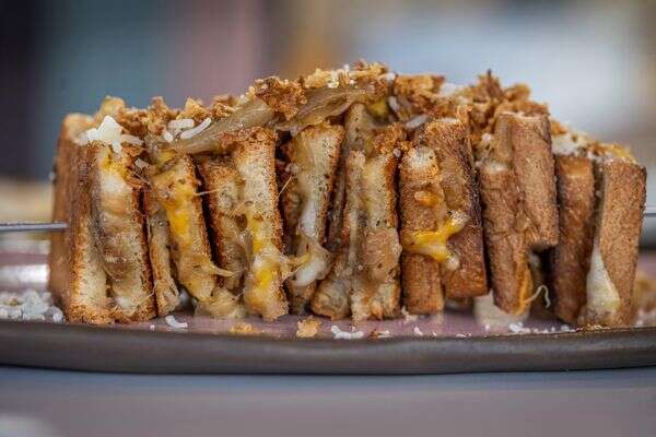 היצירה הקלויה שאתם רואים בתמונה היא רק מנה אחת מתוך התפריט החדש של קבוצת קפה גן סיפור, שמושק בימים אלה. השפית מיכל מוטיל יצרה בין היתר מטעמים דוגמת קובנה פלורנטין (קובנה במילוי תרד עם ביצה עלומה, גבינת פטה וסלסת עגבניות – 62 שקלים); לינגוויני קצ'יו אה פפה בצלים מקורמלים (68 שקלים); סלט הגן האסייתי (מיקס חסות, תרד, סלרי, ברוקולי, בצל, נענע, בזיליקום, חמוציות, כרוב, אגוזי מלך ונאמס במילוי ירקות – 72 שקלים); וכאמור שיפוד טוסט בצלי מדורה שקשה להוריד ממנו את העיניים (צ'דר, פרמזן, מוצרלה, חמאה וקריספי שאלוט, מוגש עם סלט – 58 שקלים).