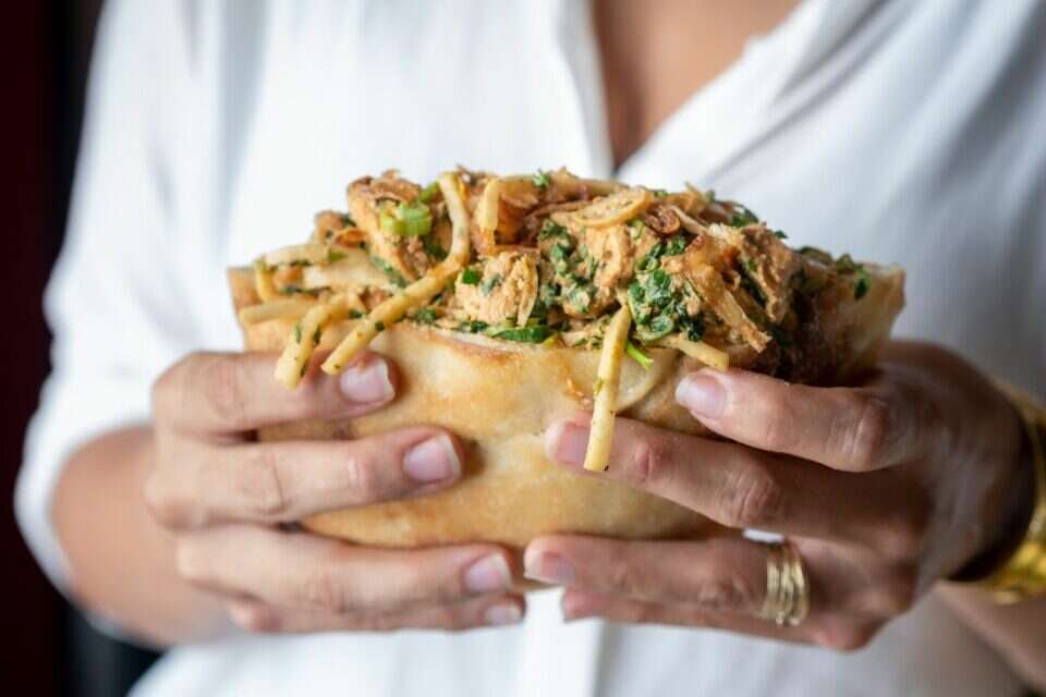 סנדביץ׳ סלט עוף אסייתי עם קולורבי, כוסברה, מיונז סרירצ׳ה חריפצ׳יק בלחם פרנה - 38 ש"ח
