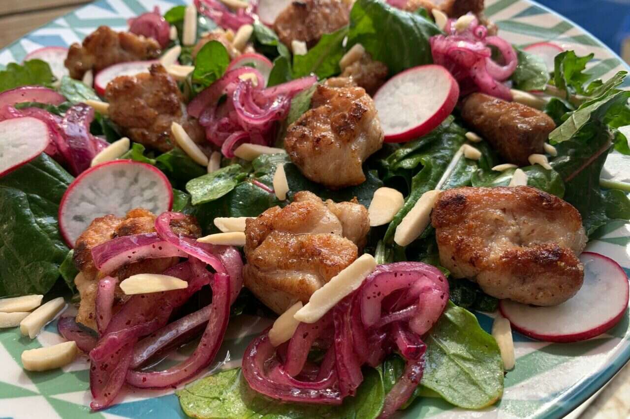 - מקשטים את הסלט בבצל סומק, פרוסות דקות של צנונית ושבבי שקדים. מומלץ לסחוט עוד לימון מעל כל הסלט.