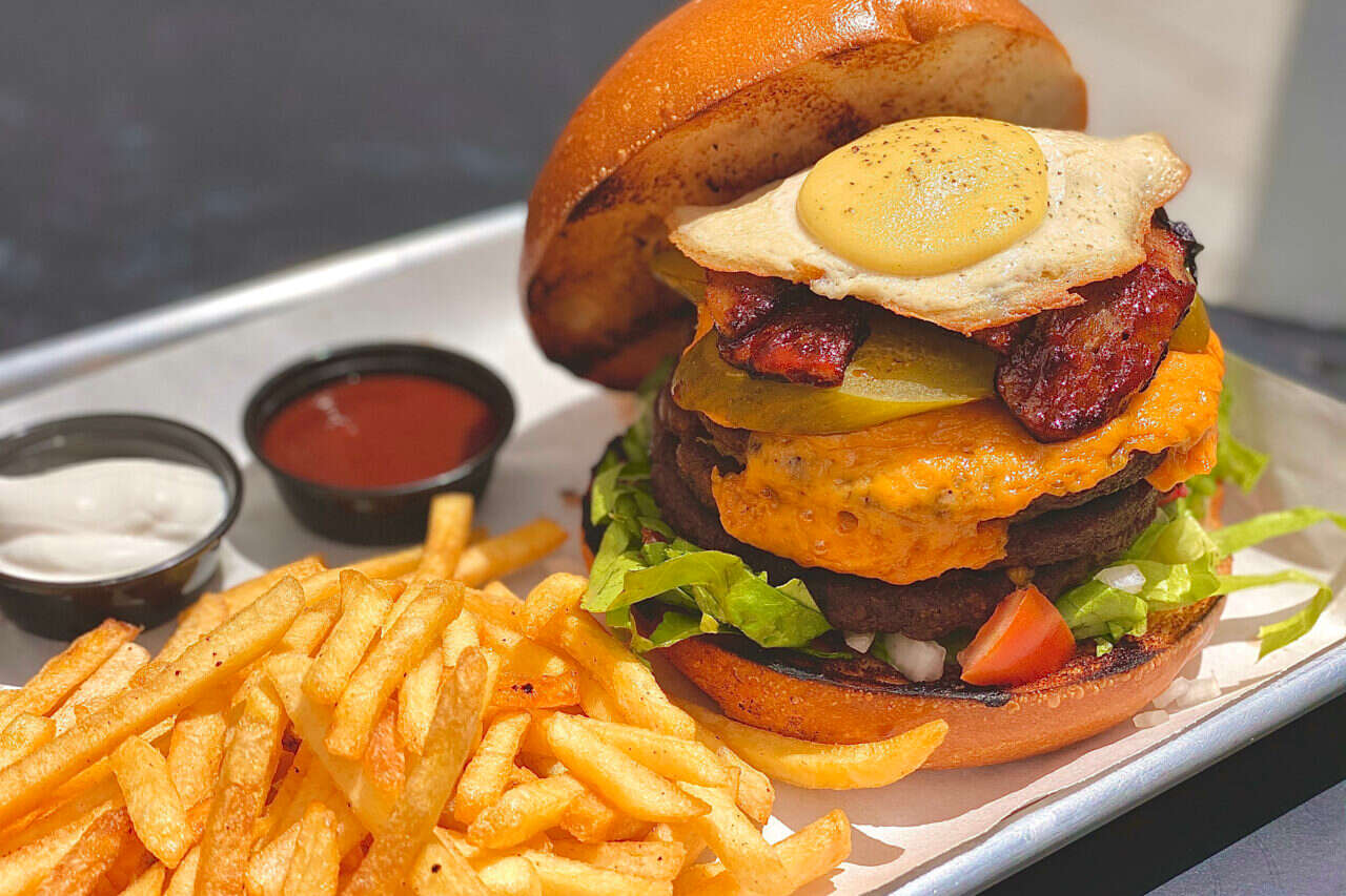 המנה הראשונה שטעמנו היא ״הענק הירוק״. מנת הדגל של המקום – המבורגר טבעוני. המנה מורכבת מקציצת חלבון סויה, ירקות, ושלל תוספות שיכולות לבוא מעל - גבינת מוצרלה, צ׳דר, שלל רטבים וכמובן שהכל - טבעוני.