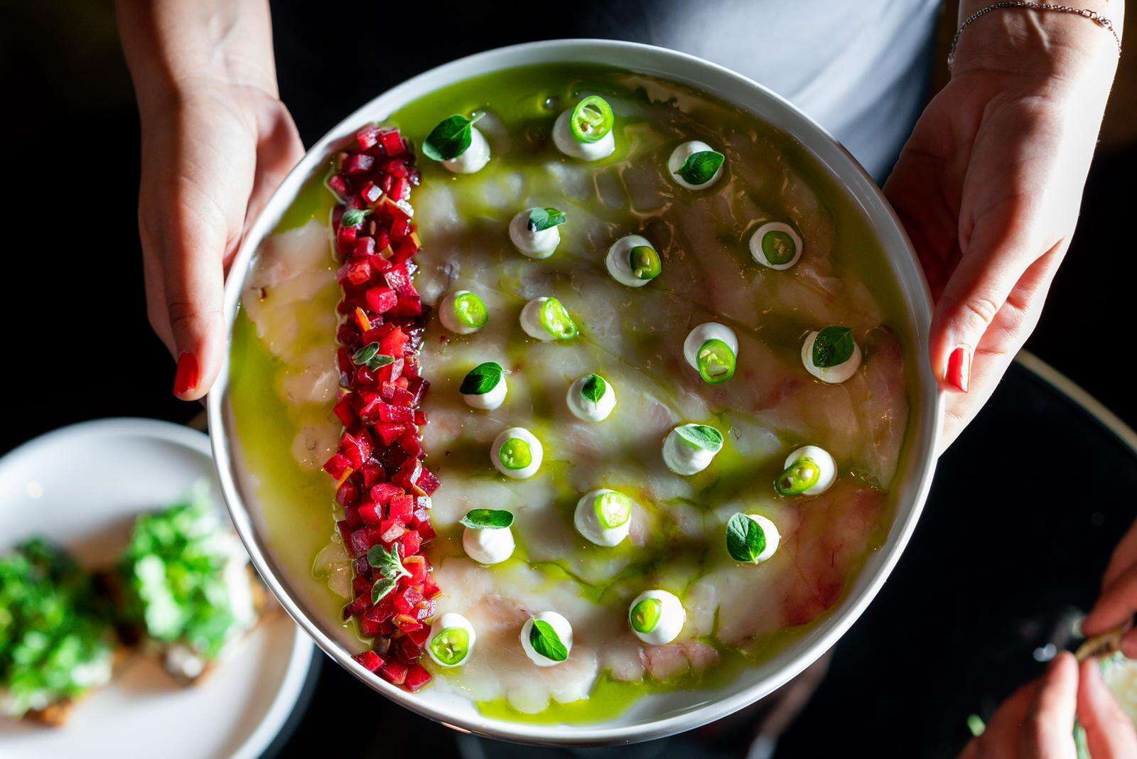 הבריוש היה נימוח בצורה מצוינת, והגיע עם שלושה סוגי מטבלים (תסמכו עליי ותלכו ישר לקרם השרי הצהוב). הקולורבי היה עדין והגבינה השתלבה איתו בצורה נכונה, הטרטר בעל מתיקות מאוזנת שהגיעה משילוב הרימונים המוחמצים והענבים, אך גם היה מעט בנאלי ולא מרגש במיוחד.