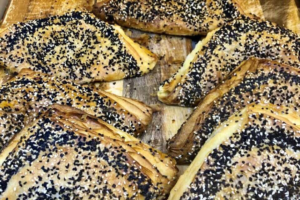 שני, בורקס מלוח שאף הוא נשען על שני עולמות טעם שונים. זה הצרפתי וזה הישראלי. בורקס עשוי מבצק קרואסון זה מתכון להצלחה מסחררת, זה היה לי כה ברור. מלית הגבינה היא אותה אחת שאנחנו אוהבים לאהוב, אולי מעט יותר עיזית מהרגיל וטוב שכך. את כל הטוב הזה עוטפת תערובת של שומשום וקצח והשמחה רבה.
