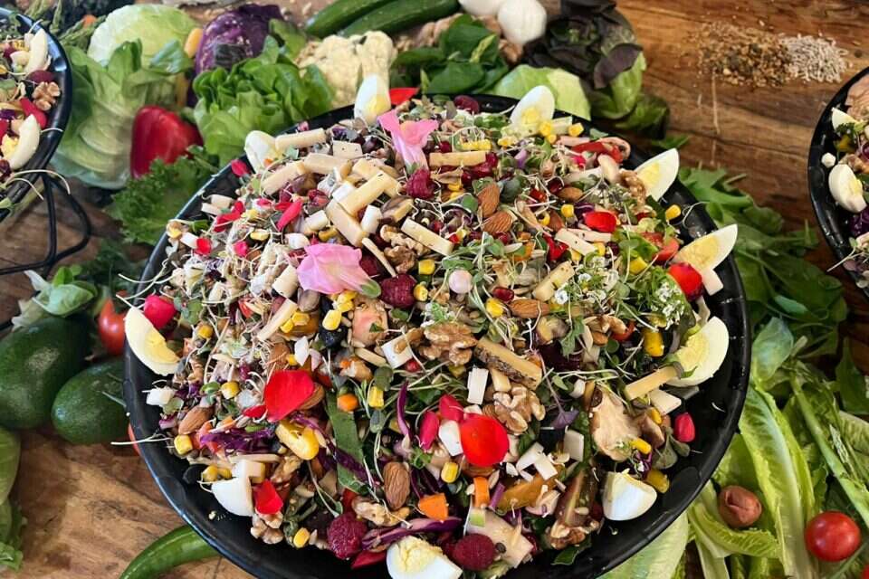 מרכיבי הסלט: אספרגוס, ארטישוק, בצל סגול, בצל שאלוט, בצל יבש, גזר, גזר מיני צבעוני, זוקיני, כרוב אדום, כרוב לבן, כרוב סיני, כרובית פיורטי, כרובית, מלפפון, פלפל מיני, סלק אדום, עגבנייה רגילה, עגבניית תמר, עגבניית מגי, עגבניית אשכול, עגבני שרי, עגבניית שרי תמר, עגבניית שרי זברה/ מנומר, עגבניית שרי מיקס, עגבניית שרי צהובה, עגבניית שרי אשכול, עגבניות שרי מיני, פלפל אדום, פלפל צהוב, פלפל כתום, פלפל בהיר, קולרבי, צנון יפני, צנונית, שומר, שעועית ירוקה שטופה, קלחי תירס מתוק, חסה רומית, חסה ערבית, חסה לליק, חסה לבבות, חסה סלנובה ראשים, חסה סלנובה עלים, חסה עגולה, לבבות חסה, מיקס עלי מיקרו, מיקרו אמרנטוס, מיקרו בזיל, מיקרו רשאד, מיקרו נבטי אפונה, מיקרו נבטי חרדל , נבטי אלפלפא ,נבטי עדשים שחורות, עלי בייבי, אורגנו, בזיליקום, חמציץ, עלי סלק, קייל סגול, שום ישראלי ,שום פנינה, שום שחור, שום שחור פנינה, סלק בואקום, תרד טורקי, תרד ניו זילנדי, פטריות שמפיניון, פטריות שינוקי, פטריות שיטאקי, פטריות שי מג'י, פטריות פורטבלה, פטריות יער, פטריות מלך היער, פטריות מאי טאקי, פרחים אכילים, אגוז לוז טבעי, אגוז מלך טבעי, גרעיני דלעת קלופים, גרעיני חמנייה קלופים, חטיף ערמונים קלופים, פיסטוק מקולף, צנובר , שקד טבעי, גבינת גאודה, קממבר, רוזמרינו, כדורי מוצרלה, פטה כבשים, אבוקדו האס בשל, אבוקדו אטינגר, לימון, לימון ליים, פטל אדום, תפוח חרמון, תפוח גרנד סמיט, תפוח מוזהב, רימון קלוף, ביצים וטחינה.