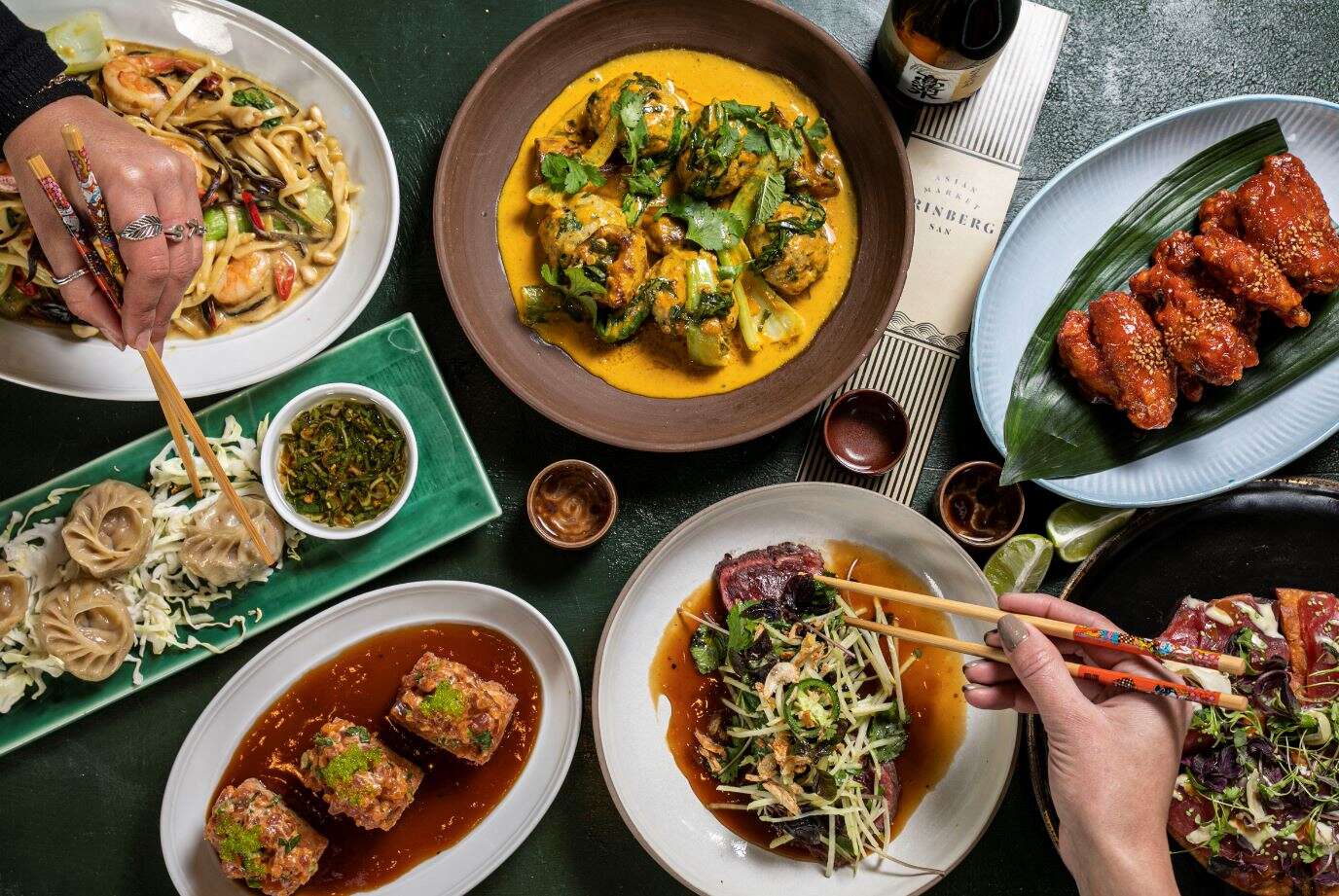 למעשה, כפי שיספר לכם צביקי עשת בעצמו בפסקאות הבאות, מדובר כאן בסוג של שלושה מקומות בתוך חלל עצום אחד. במעדניה תוכלו לקנות חומרי גלם וכלים להכנתם, החל מצירי ראמן מוכנים שהוכנו במקום ועד לבאנים קפואים. בנוסף, ישנו תפריט האוכל המוכן במקררים ובויטרינה הכולל סושי, קערות פוקי ושפע של קינוחים, באמת שפע. לבסוף, ישנו תפריט האיסוף העצמי והמשלוחים, גם הוא עצום בגודלו וכולל מנות בשריות, ראשונות ועיקריות, חלקן מבוססות על מנות ישנות מהתפריט של גרינברג וחלקן חדשות, כולן בעלות טוויסט אסיאתי.