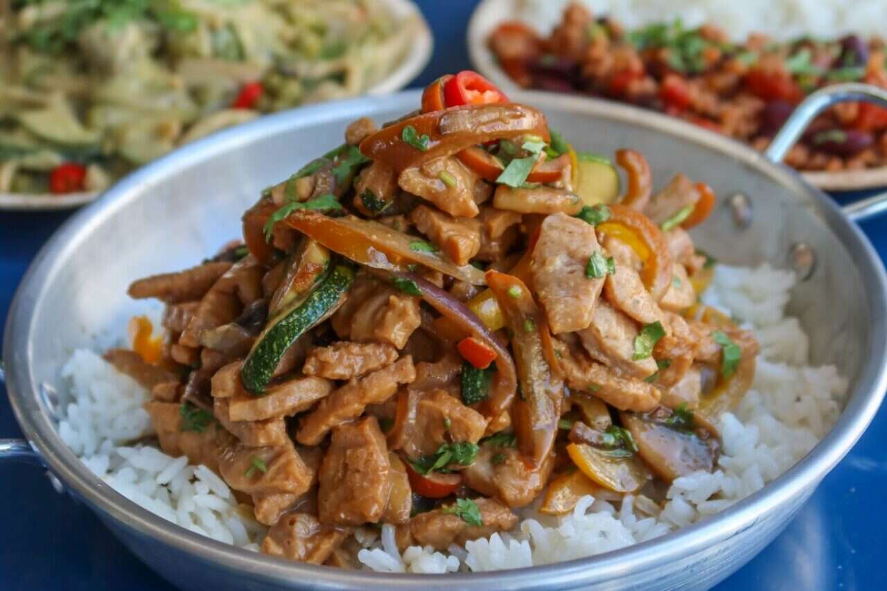מוקפץ תאילנדי עם רצועות סויה בסגנון בקר